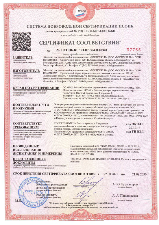 В августе 2025 года завод ГОСТКАБЕЛЬ получил сертификат огнестойких кабельных линий Промрукав. ОКЛ «ГОСТлайн-Промрукав» обеспечивают пожарную безопасность объектов: сохранят работоспособность в течение времени, которое необходимо для эвакуации людей в безопасную зону и выполнения функций электросистем.
