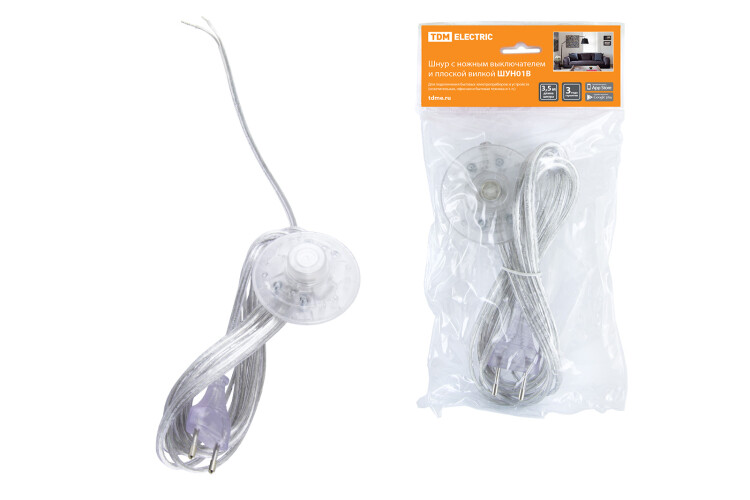 Шнур с ножным выключателем и плоской вилкой ШУН01В ШВВП 2х0,75мм2 3,5м. прозрачный TDM
