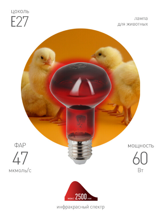 <p>Инфракрасная лампа ЭРА ИКЗК 230-60 R63 для обогрева животных 60 Вт Е27 с красной колбой активно используется в животноводстве, птицеводстве и растениеводстве. Максимальная тепловая мощность без яркого света. Идеальна для стабилизации теплового баланса новорождённых и молодых животных. 100% энергии переходит в тепловую. Работа лампы не зависит от скачков сети, микроимпульсов. Не требуются стабилизаторы напряжения, лампа работает даже при пониженном напряжении. Мгновенно включается и нагревается. Минимум пульсаций освещения. Компактные размеры.<br />