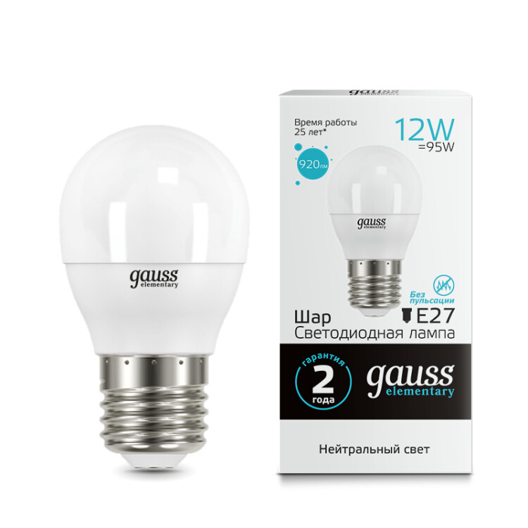 Лампа Gauss Elementary Шар 12W 920lm 4100K Е27 LED 1/10/100