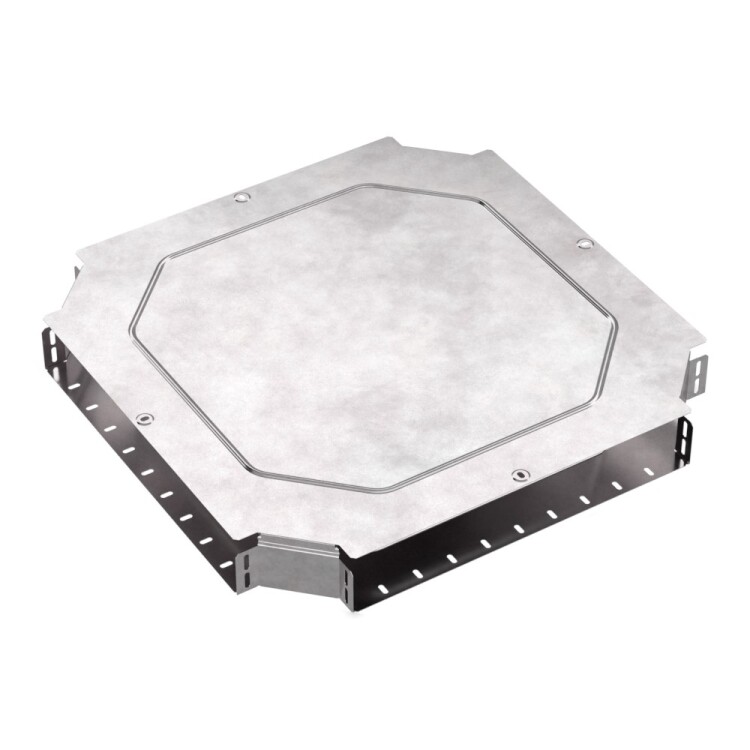 Аксессуары изготовленные из стали с защитным покрытием по методу Сендзимира – это изделия, на которых защитное цинковое покрытие было нанесено на листовую сталь перед изготовлением. Толщина защитного покрытия варьируется от 10 до 22мкм. Климатическое исполнение изделий УХЛ2, что предусматривают эксплуатацию в помещении и под навесом, при температуре эксплуатации от -80 до +150°С. Ответвитель X-обр азный предназначен для разветвления кабельных трасс в горизонтальном направлении, для перфорированных и глухих лотков. В комплект входит крышка.