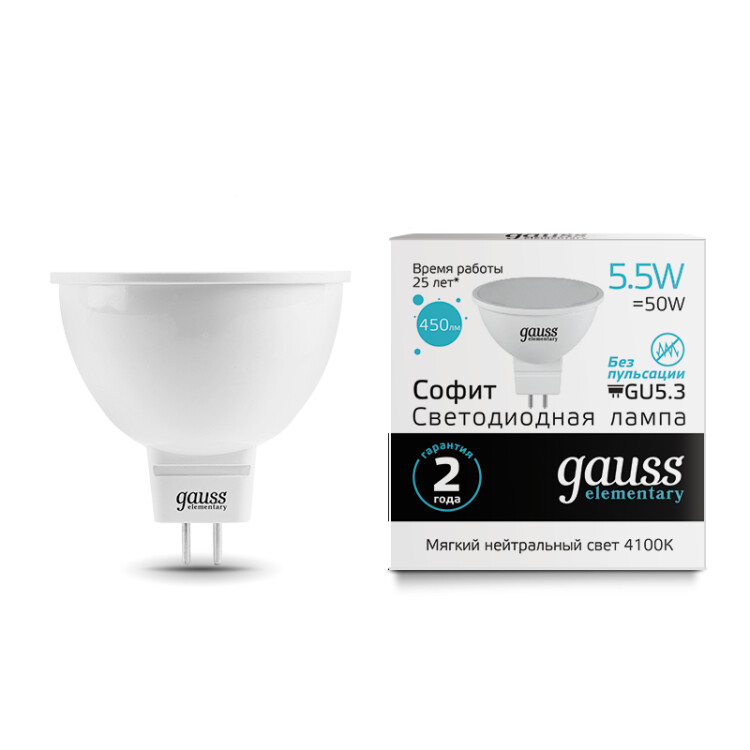 Лампа Gauss LED Elementary, MR16, цоколь GU5.3, мощность 5.5W, цветовая температура 4100К
