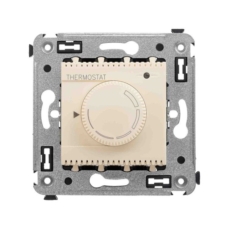 Термостат для теплых полов. Назначение – для монтажа в подрозеточные коробки глубиной не менее 45 мм (код 59301). Предназначен для управления теплыми полами. Характеристики – диапазон от 5 до 30 градусов Цельсия, частота - 50-60 Гц, номинальное напряжение - 230 В, лампа-индикатор включается, когда температура в комнате падает ниже выбранного значения, нагрузка – 12 A - cos-1, 4,8 A - cos-0,4, фиксация в подрозеточные коробки глубиной не менее 45 мм при помощи каркаса с лапками (код 4400802) и саморезов, провод датчика температуры в комплекте (длина 3,5 метра). Цвет – ""Ванильная дымка"".