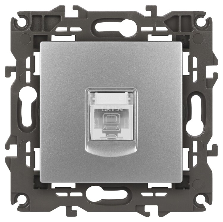 Розетка интернет RJ45 серии Эра Elegance цвет алюминий 14-3107-03. Рамки приобретаются отдельно. Рамки Эра Elegance ПЛАСТИК: 1 пост 14-5001-хх, 2 поста 14-5002-хх, 3 поста 14-5003-хх, 4 поста 14-5004-хх, 5 постов 14-5005-хх; СТЕКЛО: 1 пост 14-5101-хх, 2 поста 14-5102-хх, 3 поста 14-5103-хх, 4 поста 14-5104-хх; МЕТАЛЛ: 1 пост 14-5201-хх, 2 поста 14-5202-хх, 3 поста 14-5203-хх, 4 поста 14-5204-хх; ДЕРЕВО: 1 пост 14-5301-хх, 2 поста 14-5302-хх, 3 поста 14-5303-хх, 4 поста 14-5304-хх (хх - код цвета: 00-прозрачный, 01-белый, белёный дуб, 02-слоновая кость, 03-алюминий, 04-шампань, 05-чёрный, чёрное дерево, 07-ясень, 09-дуб, 10-венге, 11-клён, 14-медь, 21-жёлтый, 22-оранжевый, 23-красный, 25-бордо, 26-лайм, 27-зелёный, 28-голубой, 29-синий, 30-розовый, 31-мокко, 32-серый, 41-сталь, 42-титан).