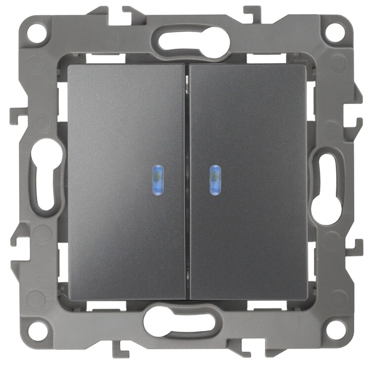 Выключатель 2-клавишный с подсветкой серии Эра 12 скрыт.установки механизм цвет графит 12-1105-12. Номинальные характеристики 10А 250В . Сделан из поликарбоната, оснащёно автоматическими клеммами для быстрй и надёжной фиксации жил кабеля в механиме. Парные клеммы обеспечивают соединение шлейфом. Монтаж в подрозетник производится и на лапки, и на винты. Рамки приобретаются отдельно. Рамки Эра 12: 1 пост 12-5001-хх, 2 поста 12-5002-хх, 3 поста 12-5003-хх, 4 поста 12-5004-хх, 5 постов 12-5005-хх. Рамки Эра 12 Сатин: 1 пост 12-5101-хх, 2 поста 12-5102-хх, 3 поста 12-5103-хх, 4 поста 12-5104-хх, 5 постов - 12-5105-хх (хх - код цвета: 01-белый, 02-слоновая кость, 03-алюминий, 04-шампань, 05-антрацит, 06-чёрный, 07-ольха(белёный дуб-сатин), 08-вишня, 09-дуб, 10-венге, 11-сосна, 21-жёлтый, 22-оранжевый, 23-красный, 24-охра, 25-бордо, 26-лайм, 27-зелёный, 28-голубой, 29-синий).