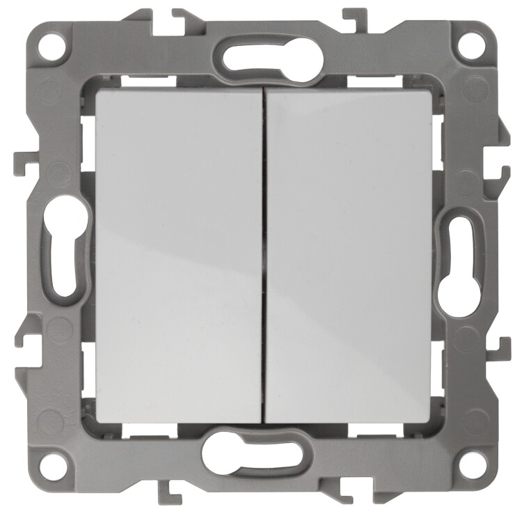Выключатель 2-клавишный проходной серии Эра 12 скрытой установки механизм цвет белый 12-1106-01. Номинальные характеристики 10А 250В . Сделан из поликарбоната, оснащёно автоматическими клеммами для быстрй и надёжной фиксации жил кабеля в механиме. Парные клеммы обеспечивают соединение шлейфом. Монтаж в подрозетник производится и на лапки, и на винты. Рамки приобретаются отдельно. Рамки Эра 12: 1 пост 12-5001-хх, 2 поста 12-5002-хх, 3 поста 12-5003-хх, 4 поста 12-5004-хх, 5 постов 12-5005-хх. Рамки Эра 12 Сатин: 1 пост 12-5101-хх, 2 поста 12-5102-хх, 3 поста 12-5103-хх, 4 поста 12-5104-хх, 5 постов - 12-5105-хх (хх - код цвета: 01-белый, 02-слоновая кость, 03-алюминий, 04-шампань, 05-антрацит, 06-чёрный, 07-ольха(белёный дуб-сатин), 08-вишня, 09-дуб, 10-венге, 11-сосна, 21-жёлтый, 22-оранжевый, 23-красный, 24-охра, 25-бордо, 26-лайм, 27-зелёный, 28-голубой, 29-синий).