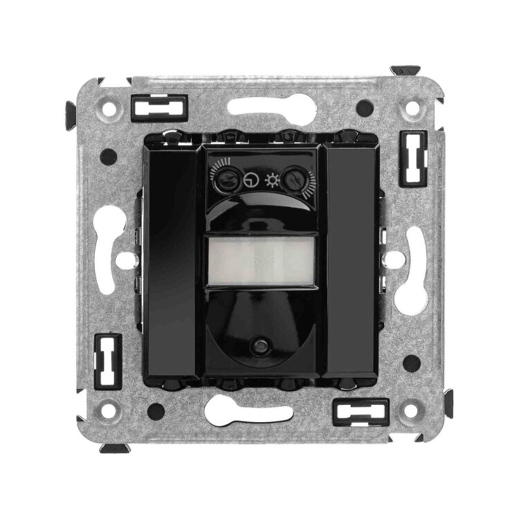 Датчик движения. Назначение – для монтажа в подрозеточные коробки глубиной не менее 45 мм (код 59301). Используется для автоматического включения/выключения света. Характеристики – диаметр отверстий для ввода кабелей - 3 мм, винтовые зажимы, шаблон для зачистки кабеля - 11 мм, расстояние обнаружения - от 2 до 12 м, угол охвата - 150 градусов, время задержки отключения - от 10 с до 7 мин., настройка светочувствительности датчика, настройка порога освещенности, фиксация в подрозеточные коробки глубиной не менее 45 мм при помощи каркаса с лапками (код 4400802) и саморезов. Цвет – ""Черный квадрат"".