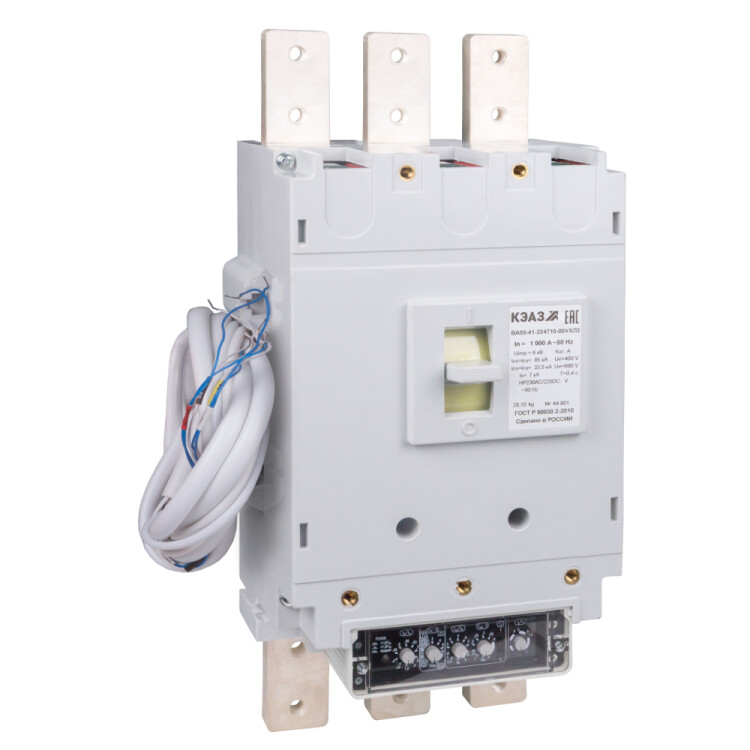 Силовой 3 полюсный автоматический выключатель переменного тока в литом корпусе на номинальный ток 1000 А. Выключатели КЭАЗ предназначены для применения в электрических цепях переменного тока частоты 50, 60 Гц напряжением 690 В, для нечастых оперативных включений и отключений (до 6 в час), указанных цепей и защиты электрооборудования от перегрузок и коротких замыкании, а также нечастых прямых пусков асинхронных двигателей. Выключатели изготавливаются с полупроводниковым максимальным расцепителем тока на базе микроконтроллера Almega 16L.
