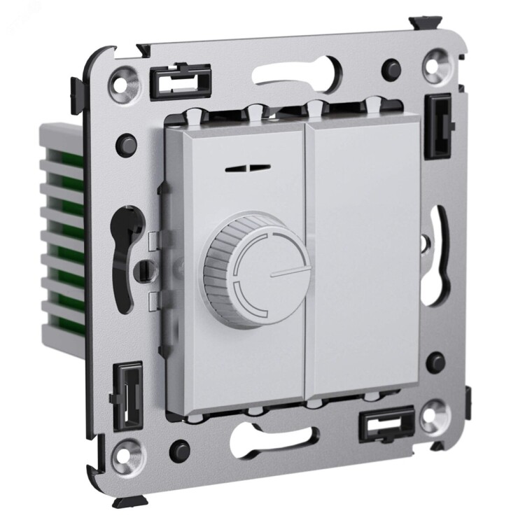 Диммер поворотный для монтажа в стену. Назначение- для монтажа в подрозеточные коробки глубиной не менее 45 мм (код 59301),управление освещением помещения,регулирование 60–800 Вт для ламп накаливания и галогенных ламп. Характеристики- диаметр отверстий для ввода кабелей – 3 мм,винтовые зажимы,шаблон для зачистки кабеля – 11 мм,встроенная подсветка. Кол-во модулей- 2. Цвет- ‘Закаленная сталь‘