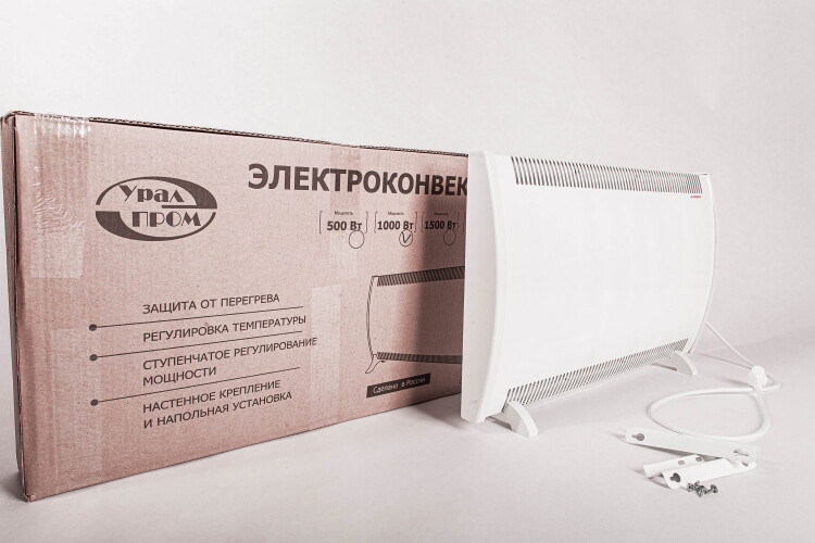 Электрический конвектор ЭВУС-1,0 представляет собой кожух, внутри которого расположены два трубчатых оребренных электронагревательных элемента (ТЭНР), на рисунке не показаны. Нагреватели закреплены на основании корпуса и соединены последовательно на напряжение 220В. В цепь питания нагревателей включен клавишный выключатель, термовыключатель защиты от перегрева и терморегулятор (на рисунке не показаны). Индикация включенного в сеть электрического конвектора ЭВУС-1,0 производится лампочкой клавишного выключателя. Регулировку температуры воздуха производят терморегулятором, вращая ручку управления по направлению шкалы. Для подключения к питающей сети конвектор электрический ЭВУС-1,0 оснащен шнуром питания с вилкой. Для установки конвектора электрического ЭВУС-1,0 на стене предусмотрены кронштейны.
