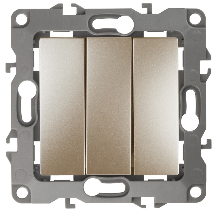 Выключатель 3-клавишный серии Эра 12 скрытой установки механизм цвет шампань 12-1107-04. Номинальные характеристики 10А 250В . Сделан из поликарбоната, оснащён винтовыми уникальными клеммами ЭКСПЕРТ для надёжной фиксации жил кабеля в механиме. Парные клеммы обеспечивают соединение шлейфом. Монтаж в подрозетник производится и на лапки, и на винты. Рамки приобретаются отдельно. Рамки Эра 12: 1 пост 12-5001-хх, 2 поста 12-5002-хх, 3 поста 12-5003-хх, 4 поста 12-5004-хх, 5 постов 12-5005-хх. Рамки Эра 12 Сатин: 1 пост 12-5101-хх, 2 поста 12-5102-хх, 3 поста 12-5103-хх, 4 поста 12-5104-хх, 5 постов - 12-5105-хх (хх - код цвета: 01-белый, 02-слоновая кость, 03-алюминий, 04-шампань, 05-антрацит, 06-чёрный, 07-ольха(белёный дуб-сатин), 08-вишня, 09-дуб, 10-венге, 11-сосна, 21-жёлтый, 22-оранжевый, 23-красный, 24-охра, 25-бордо, 26-лайм, 27-зелёный, 28-голубой, 29-синий).