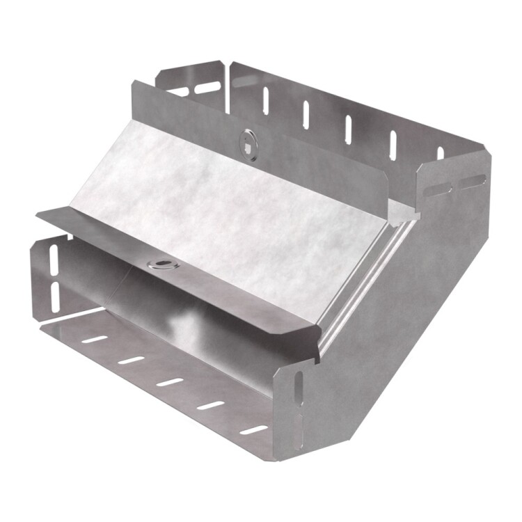 Аксессуары изготовленные из стали с защитным покрытием по методу Сендзимира – это изделия, на которых защитное цинковое покрытие было нанесено на листовую сталь перед изготовлением. Толщина защитного покрытия варьируется от 10 до 22мкм. Климатическое исполнение изделий УХЛ2, что предусматривают эксплуатацию в помещении и под навесом, при температуре эксплуатации от -80 до +150°С. Угол вертикальный внутренний 90 градусов предназначен для подъема кабельных трасс на 90 градусов, для перфорированных и глухих лотков. В комплект входит крышка.