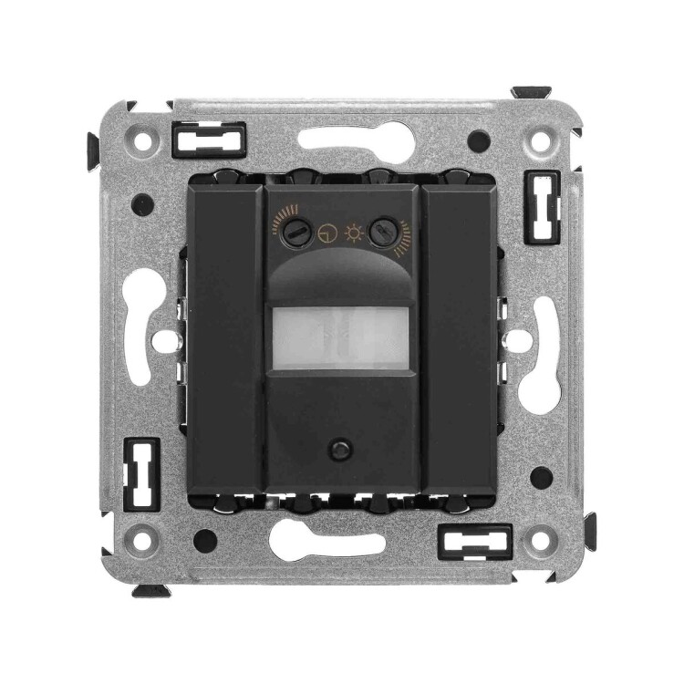 Датчик движения. Назначение – для монтажа в подрозеточные коробки глубиной не менее 45 мм (код 59301). Используется для автоматического включения/выключения света. Характеристики – диаметр отверстий для ввода кабелей - 3 мм, винтовые зажимы, шаблон для зачистки кабеля - 11 мм, расстояние обнаружения - от 2 до 12 м, угол охвата - 150 градусов, время задержки отключения - от 10 с до 7 мин., настройка светочувствительности датчика, настройка порога освещенности, фиксация в подрозеточные коробки глубиной не менее 45 мм при помощи каркаса с лапками (код 4400802) и саморезов. Цвет – ""Черный матовый"".