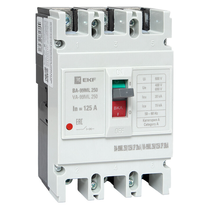 Выключатель ВА-99 выполнен в виде моноблока и состоит из основания и крышки с фальшпанелью, в которой имеется окно для рукоятки управления и толкатель кнопки «Тест» - проверки механизма отключения выключателя. Основание выполнено из термостойкой пластмассы, не поддерживающей горение и являющейся несущей конструкцией для присоединительных зажимов, неподвижных и подвижных контактов с системой дугогашения, механизма управления, блока защиты от сверхтоков. Крышка закрывает все подвижные элементы механизма управления и внутренние токоведущие части.