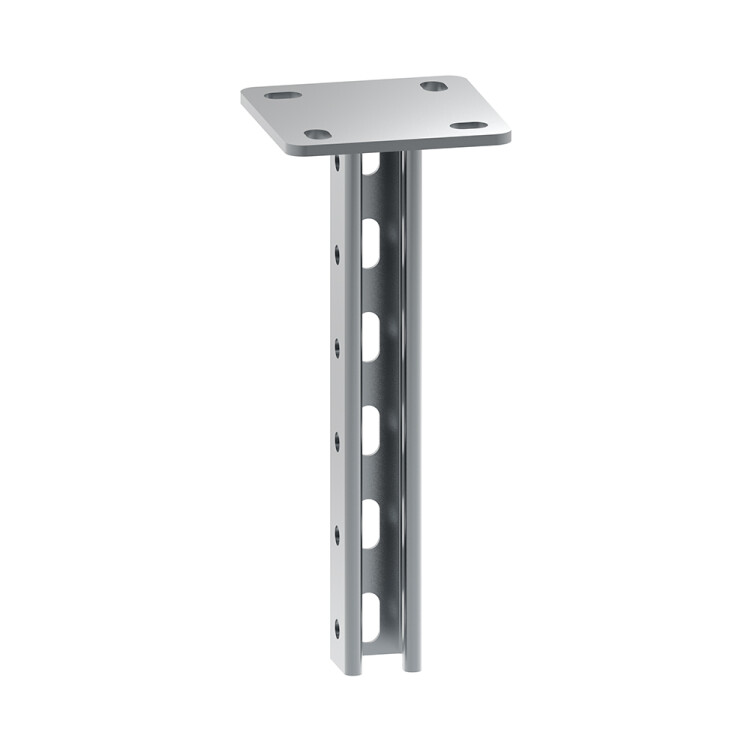 Страт-стойка используется для потолочного или напольного крепления кабельной трассы. Элемент выполнен из С-образного профиля и опорной пластины с отверстиями для крепежа. Перфорация обеспечивает удобный монтаж консолей или кабельных полок на любой высоте. Изделие выполнено из оцинкованной стали.