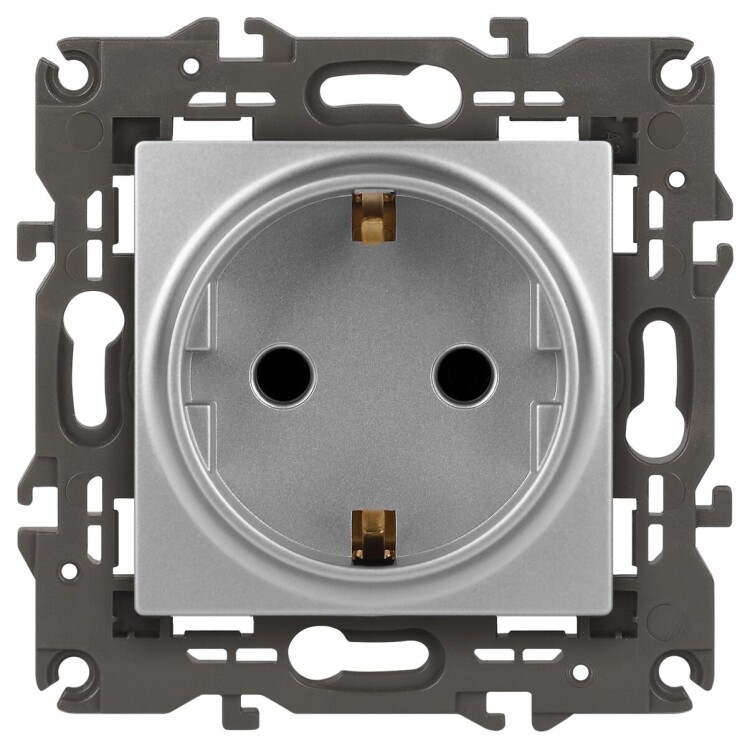 Розетка с заземлением Эра Elegance алюминий 14-2101-03. Оснащёна автоматическими клеммами для надёжной фиксации жил кабеля в механизме. Рамки приобретаются отдельно. Рамки Эра Elegance ПЛАСТИК: 1 пост 14-5001-хх, 2 поста 14-5002-хх, 3 поста 14-5003-хх, 4 поста 14-5004-хх, 5 постов 14-5005-хх; СТЕКЛО: 1 пост 14-5101-хх, 2 поста 14-5102-хх, 3 поста 14-5103-хх, 4 поста 14-5104-хх; МЕТАЛЛ: 1 пост 14-5201-хх, 2 поста 14-5202-хх, 3 поста 14-5203-хх, 4 поста 14-5204-хх; ДЕРЕВО: 1 пост 14-5301-хх, 2 поста 14-5302-хх, 3 поста 14-5303-хх, 4 поста 14-5304-хх (хх - код цвета: 00-прозрачный, 01-белый, белёный дуб, 02-слоновая кость, 03-алюминий, 04-шампань, 05-чёрный, чёрное дерево, 07-ясень, 09-дуб, 10-венге, 11-клён, 14-медь, 21-жёлтый, 22-оранжевый, 23-красный, 25-бордо, 26-лайм, 27-зелёный, 28-голубой, 29-синий, 30-розовый, 31-мокко, 32-серый, 41-сталь, 42-титан).