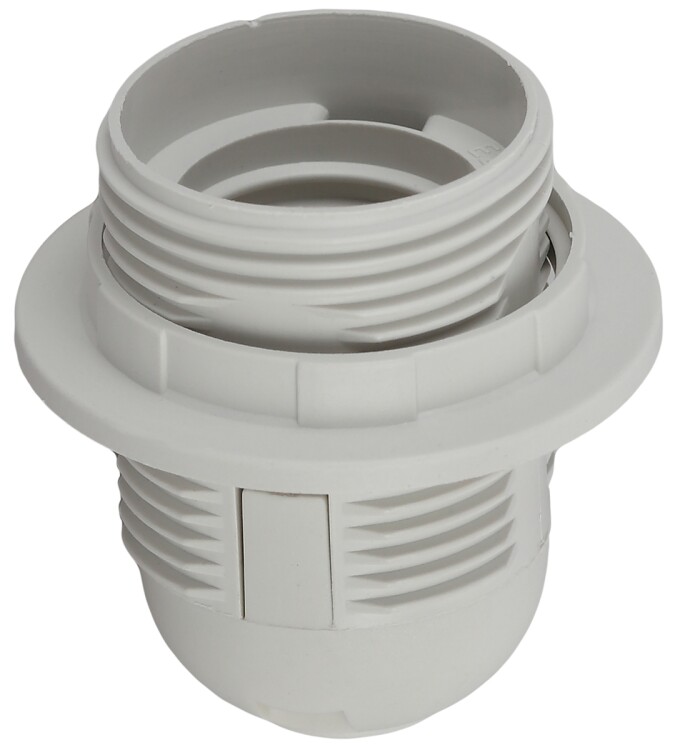 патрон с кольцом изготавливается из термостойкого пластика, материал химически устойчивый к агрессивным средам, обладает высокой прочностью и теплостойкостью; не обладает способностью выдерживать высокие температуры нагрева, поэтому его чаще всего используют для ламп накаливания мощностью не более 60 Вт