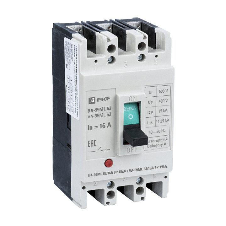 Выключатель ВА-99 выполнен в виде моноблока и состоит из основания и крышки с фальшпанелью, в которой имеется окно для рукоятки управления и толкатель кнопки «Тест» - проверки механизма отключения выключателя. Основание выполнено из термостойкой пластмассы, не поддерживающей горение и являющейся несущей конструкцией для присоединительных зажимов, неподвижных и подвижных контактов с системой дугогашения, механизма управления, блока защиты от сверхтоков. Крышка закрывает все подвижные элементы механизма управления и внутренние токоведущие части.