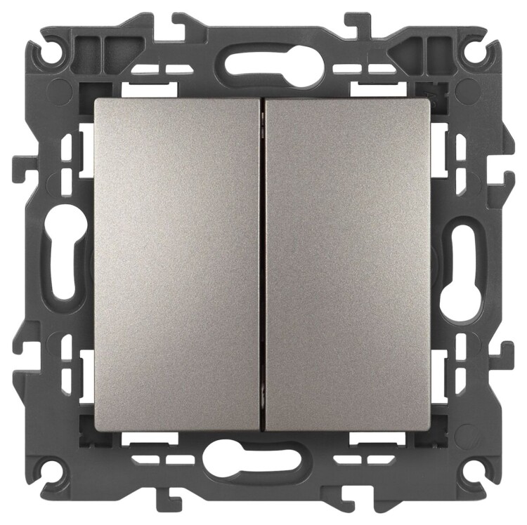 <p>Переключатель 2-клавишный проходной серии Эра Elegance цвет титан 14-1106-16. Характеристики 10А 250В. Оснащён автоматическими клеммами для надёжной фиксации жил кабеля в механизме. Рамки приобретаются отдельно.</p>