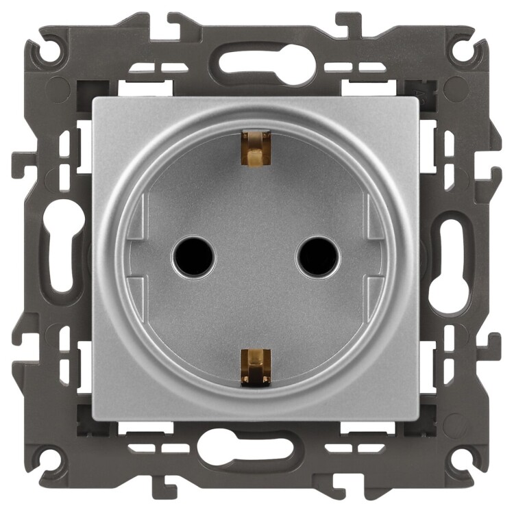 Розетка с заземлением со шторками Эра Elegance алюминий 14-2102-03. Оснащёна автоматическими клеммами для надёжной фиксации жил кабеля в механизме. Рамки приобретаются отдельно. Рамки Эра Elegance ПЛАСТИК: 1 пост 14-5001-хх, 2 поста 14-5002-хх, 3 поста 14-5003-хх, 4 поста 14-5004-хх, 5 постов 14-5005-хх; СТЕКЛО: 1 пост 14-5101-хх, 2 поста 14-5102-хх, 3 поста 14-5103-хх, 4 поста 14-5104-хх; МЕТАЛЛ: 1 пост 14-5201-хх, 2 поста 14-5202-хх, 3 поста 14-5203-хх, 4 поста 14-5204-хх; ДЕРЕВО: 1 пост 14-5301-хх, 2 поста 14-5302-хх, 3 поста 14-5303-хх, 4 поста 14-5304-хх (хх - код цвета: 00-прозрачный, 01-белый, белёный дуб, 02-слоновая кость, 03-алюминий, 04-шампань, 05-чёрный, чёрное дерево, 07-ясень, 09-дуб, 10-венге, 11-клён, 14-медь, 21-жёлтый, 22-оранжевый, 23-красный, 25-бордо, 26-лайм, 27-зелёный, 28-голубой, 29-синий, 30-розовый, 31-мокко, 32-серый, 41-сталь, 42-титан).