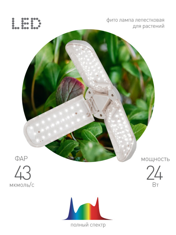 <p>Эта удобная бытовая фитолампа-трансформер полного спектра по своей мощности и эффективности не уступает профессиональному фитопрожектору. Обеспечивает качественную досветку 2 кв м рассады. Мягкий белый свет комфортен для глаз человека. Поворотные лепестки позволяют быстро и без усилий изменить направление и интенсивность освещения конкретных растений. Эффектный внешний вид и максимальный комфорт в применении. На каждом лепестке по 27 светодиодов. Каждый лепесток поворачивается на 180 градусов. Индивидуальное регулирование наклона и направления светодиодных "лепестков" дает возможность создать множество уникальных сценариев подсветки растений. </p>