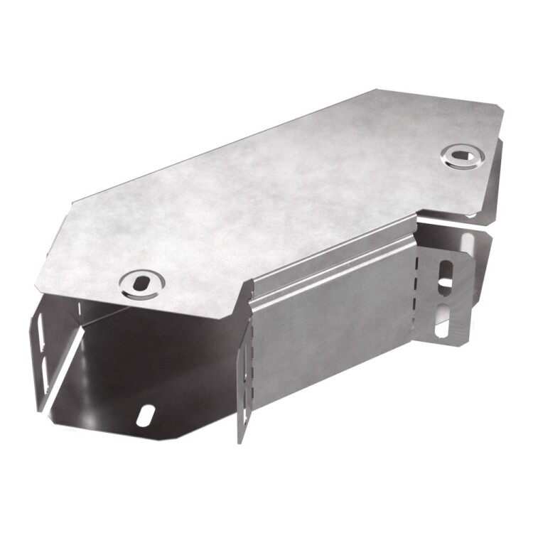 Аксессуары изготовленные из стали с защитным покрытием по методу Сендзимира – это изделия, на которых защитное цинковое покрытие было нанесено на листовую сталь перед изготовлением. Толщина защитного покрытия варьируется от 10 до 22мкм. Климатическое исполнение изделий УХЛ2, что предусматривают эксплуатацию в помещении и под навесом, при температуре эксплуатации от -80 до +150°С. Угол горизонталь ный 90 градусов предназначен для поворота кабельных трасс в горизонтальном направлении на 90 градусов, для перфорированных и глухих лотков. В комплект входит крышка.