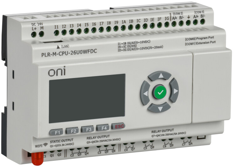 Микро ПЛК ONI. Расширяемая версия. Со встроенным экраном. 16 входов (4 как 0-20мА, 8 как 0-10В, 4 до 60кГц), 2 транзисторных выхода до 10кГц, 8 релейных выходов. Часы реального времени RTC. Архивация данных процесса при использовании стандартной SD карты. Интегрированы 2 интерфейса RS485 и 1 интерфейс Ethernet с поддержкой Modbus TCP/RTU/ASCII и MQTT протоколов. Поддержка Wi-Fi. Напряжение питания 24В DC.