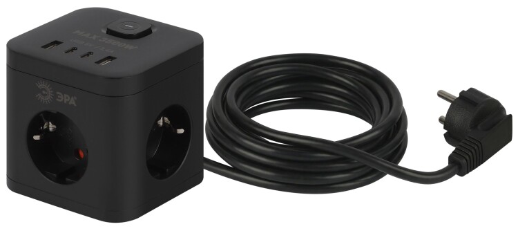 Удлинитель Эра CUBE-3es-1,5m-4USB-B рассчитан на одновременное подключение большого количества техники. На корпусе расположены 3 розетки с заземлением. Прочный корпус в виде башни из негорючего поликарбоната. Трехжильный провод ПВС обеспечивает допустимую максимальную нагрузку до 3500 Вт. Правильно подбирайте бытовые приборы, чтобы не превышать общую нагрузку на сетевой фильтр.4 USB - 2typeA+2typeC 3.4A/5V 18Вт. Длина провода модели составляет 1,5 метра. Удлинитель удобно использовать в пределах одной комнаты.