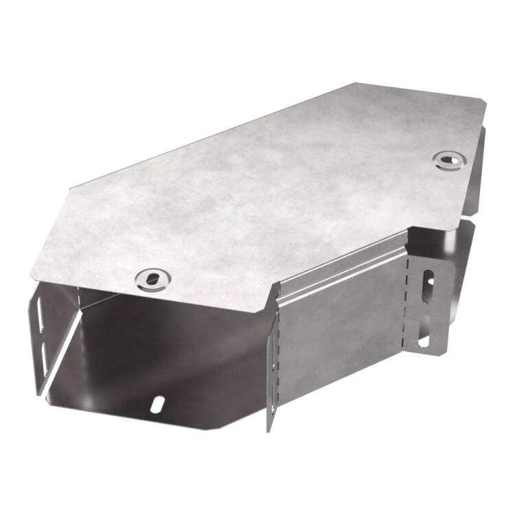 Аксессуары изготовленные из стали с защитным покрытием по методу Сендзимира – это изделия, на которых защитное цинковое покрытие было нанесено на листовую сталь перед изготовлением. Толщина защитного покрытия варьируется от 10 до 22мкм. Климатическое исполнение изделий УХЛ2, что предусматривают эксплуатацию в помещении и под навесом, при температуре эксплуатации от -80 до +150°С. Угол горизонталь ный 90 градусов предназначен для поворота кабельных трасс в горизонтальном направлении на 90 градусов, для перфорированных и глухих лотков. В комплект входит крышка.