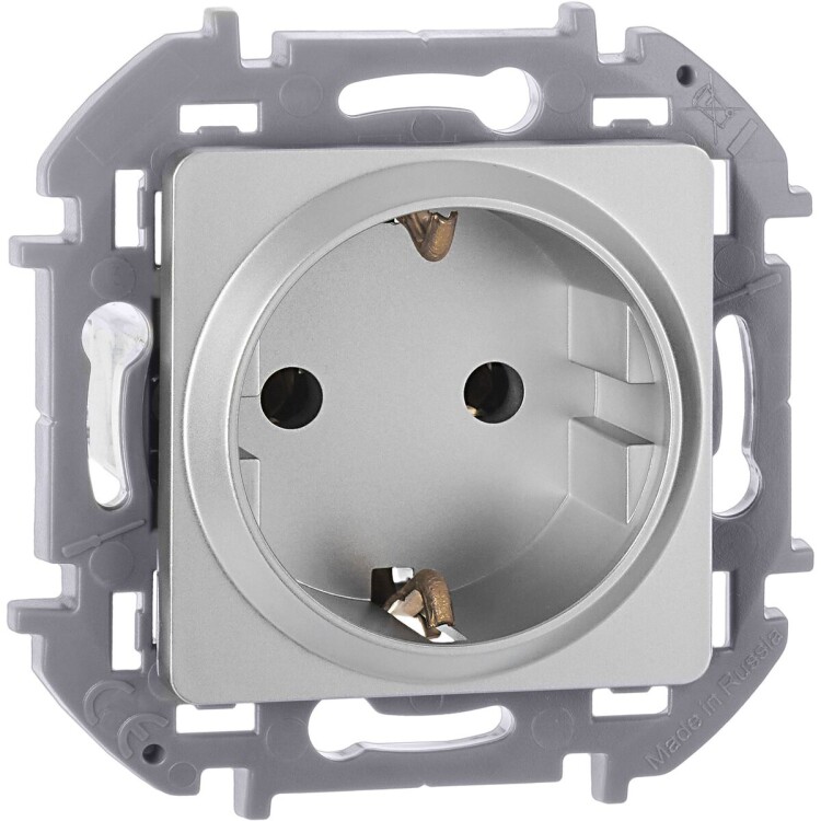 Розетка с заземлением для скрытого монтажа Inspiria, цвет "Алюминий", максимальный ток 16А, напряжение ~250В, максимальная мощность 3680Вт, винтовые зажимы. Применяется для присоединения однофазных электрических потребителей к сети переменного тока в зданиях с проводкой с заземлением (с защитным проводником).