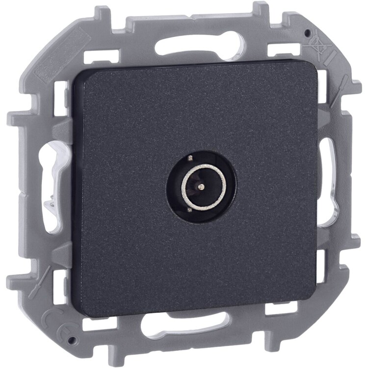Розетка телевизионная для скрытого монтажа Inspiria, оконечная для схемы "шлейф", затухание 10дБ, 4-862МГц, цвет "Антрацит". Предназначена для подключения нескольких ТВ приемников к антенне, используется в схеме "шлейф" и устанавливается в конце линии.
