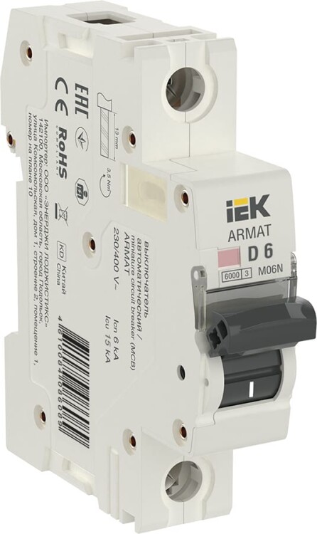 Автоматические выключатели ARMAT серии M06N предназначены для защиты цепей от перегрузки и короткого замыкания. Модельный ряд включает в себя устройства с характеристиками срабатывания B, C, D и номинальными токами от 0,5 до 63 А. Номинальная отключающая способность автоматических выключателей ARMAT серии M06N составляет 6 кА. Предельная отключающая способность варьируется в зависимости от номинала от 10 до 50 кА.