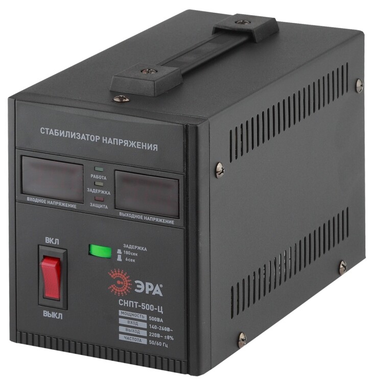 Стабилизатор напряжения переносной /напольный однофазный релейный цвет чёрный модели СНПТ-500-Ц. Номинальные характеристики (полная мощность / диапазон входного напряжения): 500ВА 140-260В . Предназначен для поддержания стабильного однофазного напряжения питания бытовых приборов при отклонениях значений сетевого напряжения. Выбирая стабилизатор, нужно знать, какое электрооборудование будет к нему подключено: один прибор, группу приборов либо вся домашняя (офисная) техника. Затем необходимо рассчитать суммарную мощность защищаемых электропотребителей. Основное условие выбора мощности стабилизатора напряжения - суммарная мощность подключаемой к нему нагрузки не должна превышать полной мощности самого стабилизатора (в противном случае автоматика стабилизатора будет их просто отключать). Точные значения мощности можно узнать из паспортных данных Вашего конкретного потребителя. Стабилизатор подбирается с запасом в 25-30% к его полной мощности.