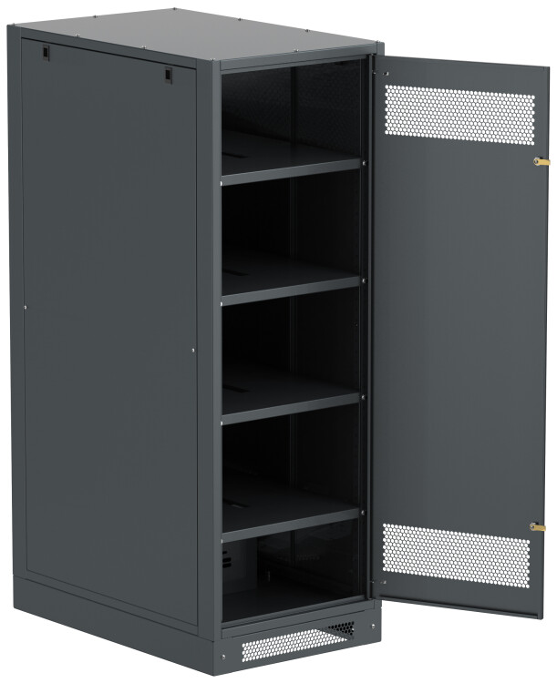 Шкаф аккумуляторный серии LINEA B предназначен для размещения и защиты от несанкционированного доступа аккумуляторных батарей (АБ). Шкафы LINEA B повышенной прочности со сварным каркасом и усиленными полками позволяют размещать АБ до 500 кг. на полке. Вместе со шкафом поставляются полки. Количество полок в комплекте зависит от высоты шкафа. Каркас позволяет размещать полки с шагом 30мм. В полках предусмотрены вырезы для удобства соединения АБ. В нижней части корпуса предусмотрена плата для установки предохранителя-выключателя-разъединителя ПВР. Шкаф аккумуляторный серии LINEA B односекционный поставляется на цоколе высотой 100мм. Все металлические части шкафа LINEA B заземлены. В комплект включены РЫМ-болты для удобства перемещения шкафа. Вентиляционные отверстия в дверях и задней панели обеспечивают циркуляцию воздуха. Для преобразования шкафа аккумуляторного серии LINEA B в стеллаж требуется снять заднюю стенку, крышку, дверь(и), боковые стенки. Широкий ассортимент типоразмеров позволяет подобрать оптимальный шкаф под требуемое количество АБ.
