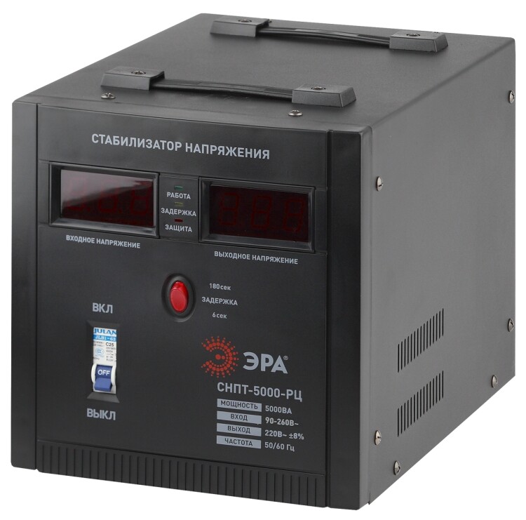 <p>Стабилизатор напряжения переносной /напольный однофазный релейный цвет чёрный модели СНПТ-5000-РЦ. Номинальные характеристики (полная мощность / диапазон входного напряжения): 5000ВА. Предназначен для поддержания стабильного однофазного напряжения питания бытовых приборов при отклонениях значений сетевого напряжения. Выбирая стабилизатор, нужно знать, какое электрооборудование будет к нему подключено: один прибор, группу приборов (наиболее чувствительных к перепадам напряжения в сети) либо вся домашняя (офисная) техника. Затем необходимо рассчитать суммарную мощность защищаемых электропотребителей. Основное условие выбора мощности стабилизатора напряжения - суммарная мощность подключаемой к нему нагрузки не должна превышать полной мощности самого стабилизатора (в противном случае автоматика стабилизатора будет их просто отключать). Точные значения мощности можно узнать из паспортных данных Вашего конкретного потребителя. Стабилизатор подбирается с запасом в 25-30% к его полной мощности.</p>