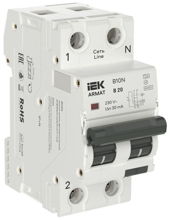 Автоматические выключатели дифференциального тока (АВДТ) ARMAT серии B10N с топологией полюсов 1P+N - надежное решение для промышленности, энергетики и бытового применения. Номинальная наибольшая отключающая способность 10 кА гарантирует надежную работу устройства даже при высоких токах короткого замыкания. Топология полюсов B10N 1P+N означает, что функции защиты от токов перегрузки и короткого замыкания, а также дугогасительная ферромагнитная решетка реализованы в фазном полюсе. Независимый механизм свободного расцепления с мгновенной коммутацией обеспечивает безопасное включение, а защитная шторка вывода исключает неправильное подключение и ошибку при монтаже проводников. Подключение шинами PIN и FORK реализовано сверху и снизу устройства. B10N 1P+N позволяет присоединять любые дополнительные модульный устройства ARMAT серии AUX (дополнительные контакты и расцепители), а также поворотную рукоятку типа RHN, блокировку рукоятки взвода типа HLC и заглушку вывода пломбировочную типа OTL. Модельный ряд включает в себя устройства с номинальными токами от 6 А до 63 А, с характеристиками срабатывания по сверхтоку B и C, типом защитной характеристики по дифференциальному току A, с номинальными дифференциальными токами отключения 30, 100, 300 мА.
