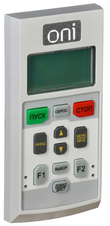 Пульт управления предназначен для настройки, управления и съема данных с Устройства Плавного Пуска (УПП) SFC ONI. Представляет собой полнотекстовый русифицированный LCD экран, блок прорезиненных клавиш в пластиковом корпусе. Питание осуществляется при подключении платы управления УПП в сеть 220В. Имеется возможность съема и выноса пульта управления на стенку шкафа и связи с УПП по витой паре. На пульте размещено изображение ТМ ONI.