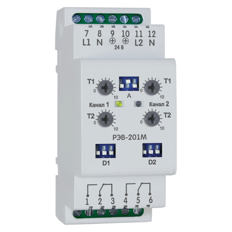 Реле времени модульное на 1 фазу питающей сети. Электронные двухканальные реле времени с задержкой на включение предназначены для коммутации электрических сетей переменного тока и постоянного тока с регулируемой задержкой по времени. Двухканальное реле времени с задержкой на включение OptiDin РЭВ-201М предназначено для коммутации электрических цепей переменного тока 230/240 В / 50 Гц и постоянного то ка 24-100 В с регулируемой задержкой времени включения от 0 до 36000 с.