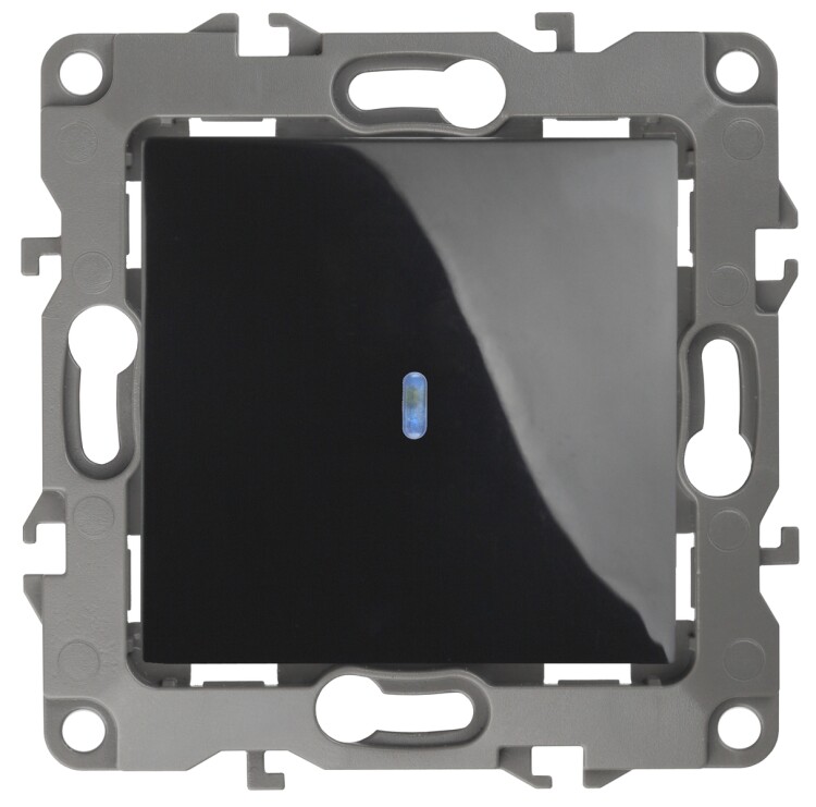 Выключатель 1-клавишный с подсветкой серии Эра 12 скрыт.установки механизм цвет чёрный 12-1102-06. Номинальные характеристики 10А 250В . Сделан из поликарбоната, оснащёно автоматическими клеммами для быстрй и надёжной фиксации жил кабеля в механиме. Парные клеммы обеспечивают соединение шлейфом. Монтаж в подрозетник производится и на лапки, и на винты. Рамки приобретаются отдельно. Рамки Эра 12: 1 пост 12-5001-хх, 2 поста 12-5002-хх, 3 поста 12-5003-хх, 4 поста 12-5004-хх, 5 постов 12-5005-хх. Рамки Эра 12 Сатин: 1 пост 12-5101-хх, 2 поста 12-5102-хх, 3 поста 12-5103-хх, 4 поста 12-5104-хх, 5 постов - 12-5105-хх (хх - код цвета: 01-белый, 02-слоновая кость, 03-алюминий, 04-шампань, 05-антрацит, 06-чёрный, 07-ольха(белёный дуб-сатин), 08-вишня, 09-дуб, 10-венге, 11-сосна, 21-жёлтый, 22-оранжевый, 23-красный, 24-охра, 25-бордо, 26-лайм, 27-зелёный, 28-голубой, 29-синий).