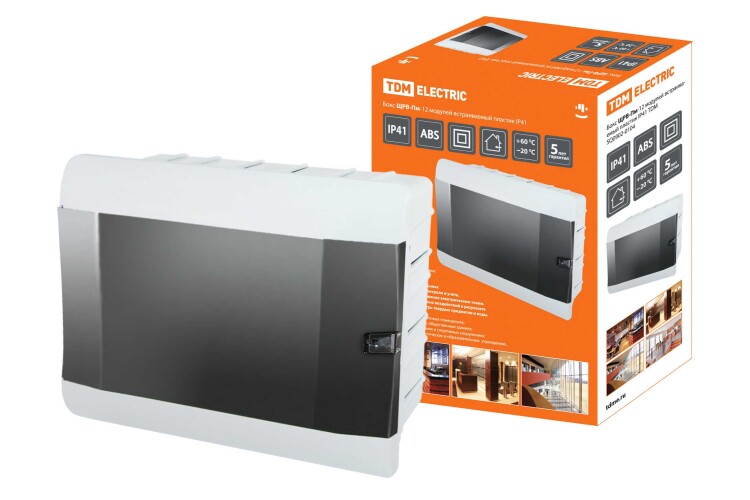 Бокс ЩРВ-Пм-12 модулей встраиваемый пластик IP41 TDM предназначен для установки модульных устройств защиты и управления на токи до 125 А и защиты потребителей от поражения электрическим током.