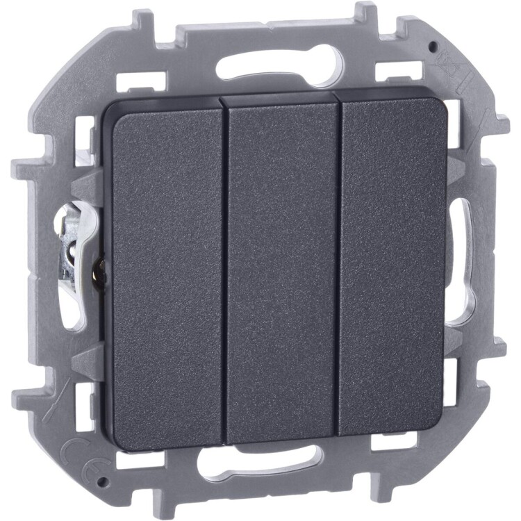 Выключатель трёхклавишный скрытого монтажа Inspiria, цвет "Антрацит", номинальный ток 10АХ, напряжение ~250В, винтовые зажимы. Устанавливается в жилых и общественных помещениях для управления приборами освещения, вентиляции и т.д. Предназначен для независимой коммутации трёх нагрузок с одного места. Подходит для управления многорожковыми люстрами и осветительными приборами с большим количеством ла мп.