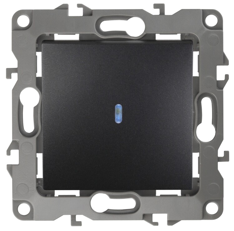 Выключатель 1-клавишный с подсветкой серии Эра 12 скрыт.установки механизм цвет антрацит 12-1102-05. Номинальные характеристики 10А 250В . Сделан из поликарбоната, оснащёно автоматическими клеммами для быстрй и надёжной фиксации жил кабеля в механиме. Парные клеммы обеспечивают соединение шлейфом. Монтаж в подрозетник производится и на лапки, и на винты. Рамки приобретаются отдельно. Рамки Эра 12: 1 пост 12-5001-хх, 2 поста 12-5002-хх, 3 поста 12-5003-хх, 4 поста 12-5004-хх, 5 постов 12-5005-хх. Рамки Эра 12 Сатин: 1 пост 12-5101-хх, 2 поста 12-5102-хх, 3 поста 12-5103-хх, 4 поста 12-5104-хх, 5 постов - 12-5105-хх (хх - код цвета: 01-белый, 02-слоновая кость, 03-алюминий, 04-шампань, 05-антрацит, 06-чёрный, 07-ольха(белёный дуб-сатин), 08-вишня, 09-дуб, 10-венге, 11-сосна, 21-жёлтый, 22-оранжевый, 23-красный, 24-охра, 25-бордо, 26-лайм, 27-зелёный, 28-голубой, 29-синий).