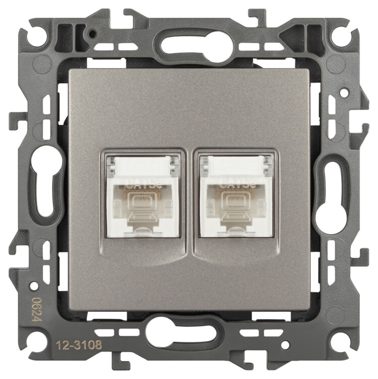 <p>Розетка информационная двойная 2хRJ45 серии Эра 12 скрытой установки механизм цвет титан 12-3108-16. Сделана из поликарбоната. Монтаж в подрозетник производится и на лапки, и на винты. Рамки приобретаются отдельно.</p>