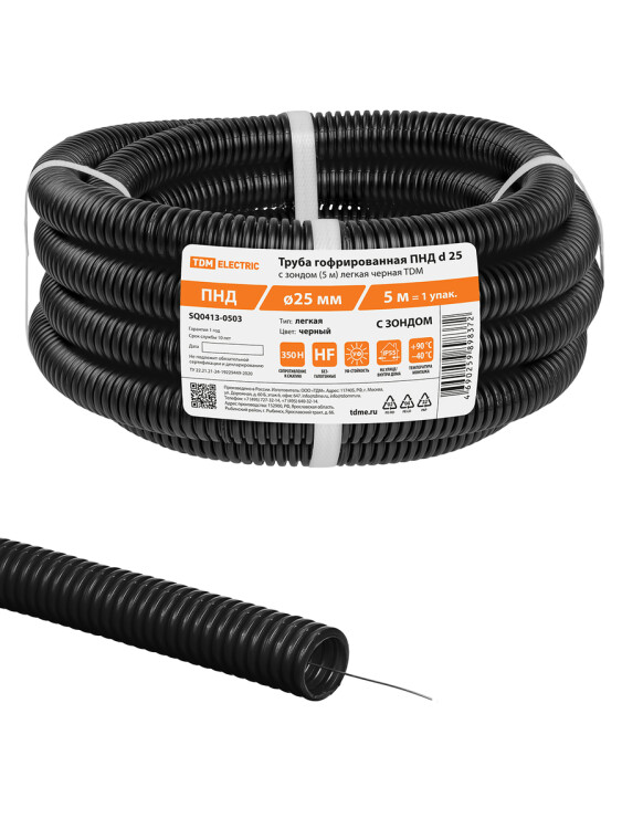 Труба гофрированная ПНД d 25 с зондом (5 м) легкая 350Н черная TDM