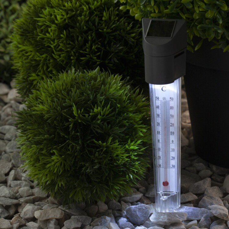 <p>Уличный светильник градусник ERATR024-02 станет практичным дополнением на Вашем загородном участке или дома. Садовый термометр замеряет температуру воздуха. Можно устанавливать на газоне, в цветочный горшок. Устройство из пластика высотой 33 см с легко втыкается в землю с помощью заостренной ножки в комплекте. Садовый светильник работает на солнечной батарее. Данный вид получения энергии является максимально экологичным, энергоемким, а также бесшумным. Питание происходит во включенном режиме, в дневное время. В темное время суток загорается встроенная в корпус лампочка. Высокая степень защиты от пыли и влаги позволяет оставлять светильник на улице даже во время дождя. Декоративный садово-парковый светильник от бренда ЭРА компактный вариант для замера температуры воздуха на Вашем участке.</p>