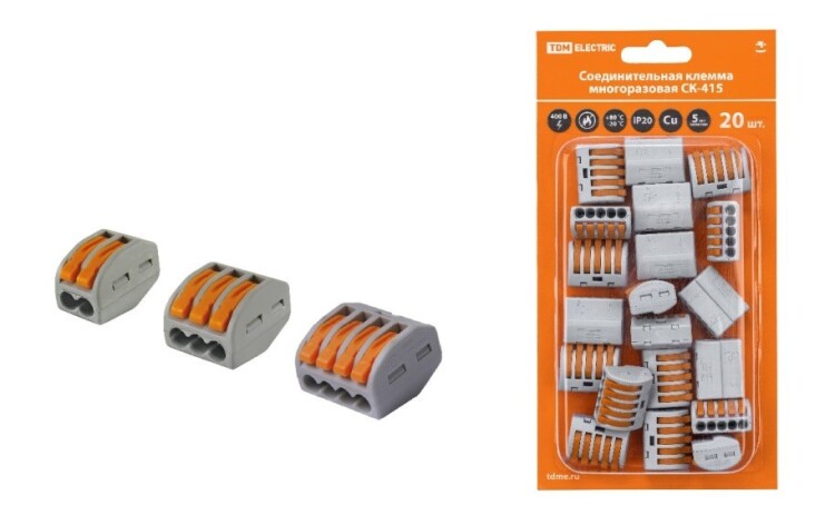 Применение: Для присоединения и ответвления до 5 одножильных проводников сечением от 0,1 мм? до 2,5 мм? и многожильных медных проводников сечением от 0,1 мм? до 4 мм? в электрических цепях переменного тока с частотой 50Гц напряжением до 380В.