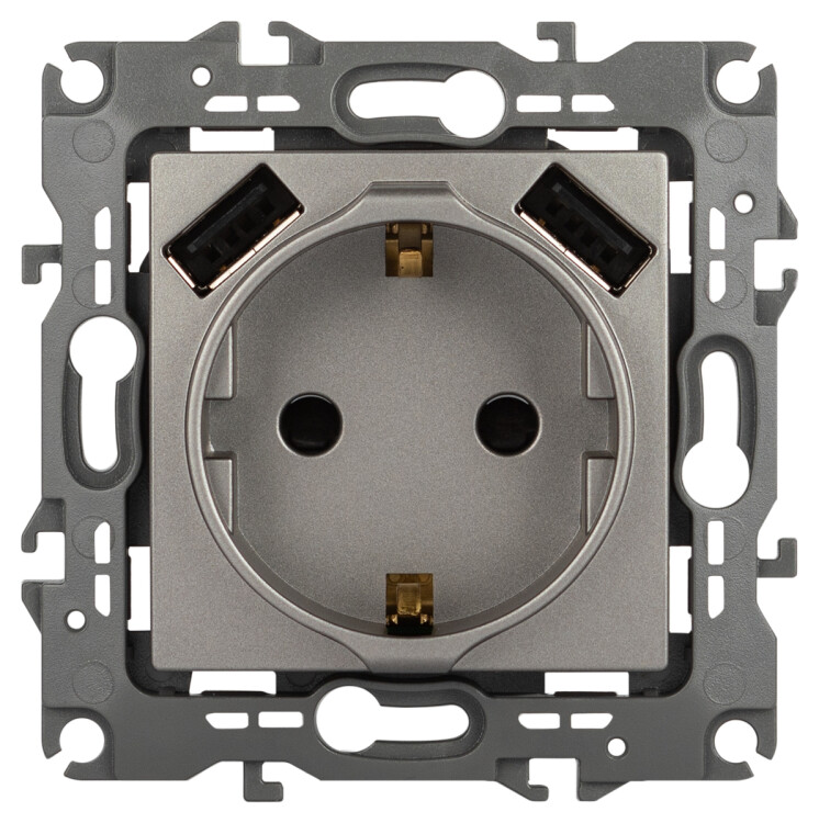 <p>Розетка с заземлением с USB со шторками серии Эра 12 скрытой установки механизм цвет титан 12-4109-16. Номинальные характеристики 16А 250В/3А-5В. Сделана из поликарбоната. Монтаж в подрозетник производится и на лапки, и на винты. Рамки приобретаются отдельно.</p>