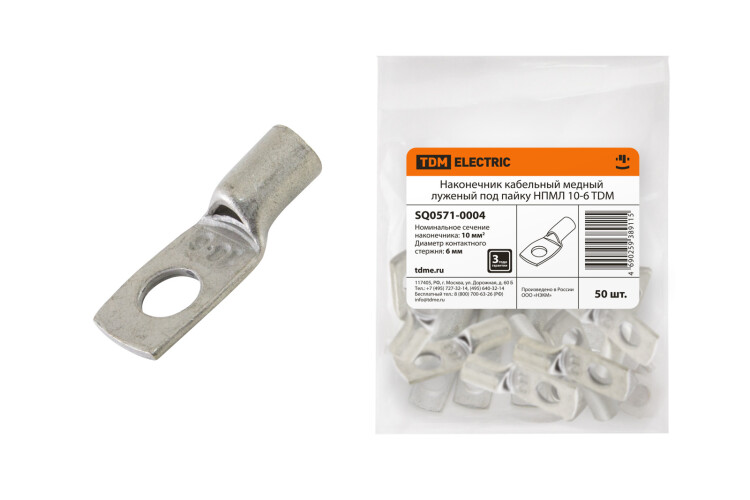 Назначение: • Для оконцевания пайкой или опрессовкой медных жил кабелей и проводов. Применение: • Для присоединения жил кабелей и проводов к шинам, выводам автоматических выключателей и других электрических устройств. Материалы: • Электротехническая медь М1. • Покрытие оловянно-висмутовое, нанесенное методом электролитического лужения. Преимущества: • Изготавливаются из медной трубки, по своим параметрам соответствуют наконечникам ПМ, изготавливаемым из листовой меди. • Допустимо применение опрессовки без ограничений, а также комбинированное использование пайки и опрессовки. Расшифровка: Наконечник Под пайку Медный Луженый Сечение жилы кабеля в кв. мм Диаметр контактного стержня в мм Торговая марка Упаковка • Групповая – полиэтиленовый пакет. • Транспортная – картонная коробка.