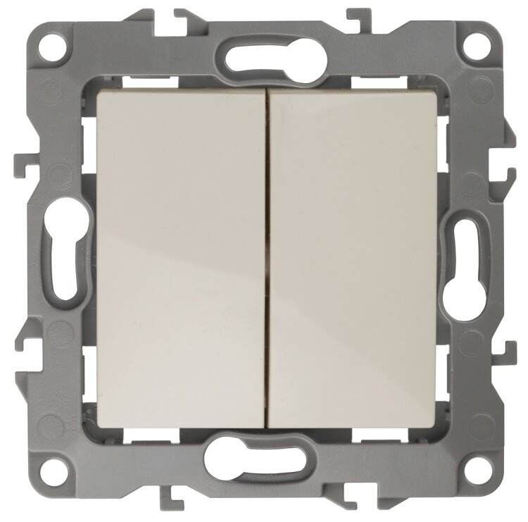 Выключатель 2-клавишный серии Эра 12 скрытой установки механизм цвет слоновая кость 12-1104-02. Номинальные характеристики 10А 250В . Сделан из поликарбоната, оснащёно автоматическими клеммами для быстрй и надёжной фиксации жил кабеля в механиме. Парные клеммы обеспечивают соединение шлейфом. Монтаж в подрозетник производится и на лапки, и на винты. Рамки приобретаются отдельно. Рамки Эра 12: 1 пост 12-5001-хх, 2 поста 12-5002-хх, 3 поста 12-5003-хх, 4 поста 12-5004-хх, 5 постов 12-5005-хх. Рамки Эра 12 Сатин: 1 пост 12-5101-хх, 2 поста 12-5102-хх, 3 поста 12-5103-хх, 4 поста 12-5104-хх, 5 постов - 12-5105-хх (хх - код цвета: 01-белый, 02-слоновая кость, 03-алюминий, 04-шампань, 05-антрацит, 06-чёрный, 07-ольха(белёный дуб-сатин), 08-вишня, 09-дуб, 10-венге, 11-сосна, 21-жёлтый, 22-оранжевый, 23-красный, 24-охра, 25-бордо, 26-лайм, 27-зелёный, 28-голубой, 29-синий).
