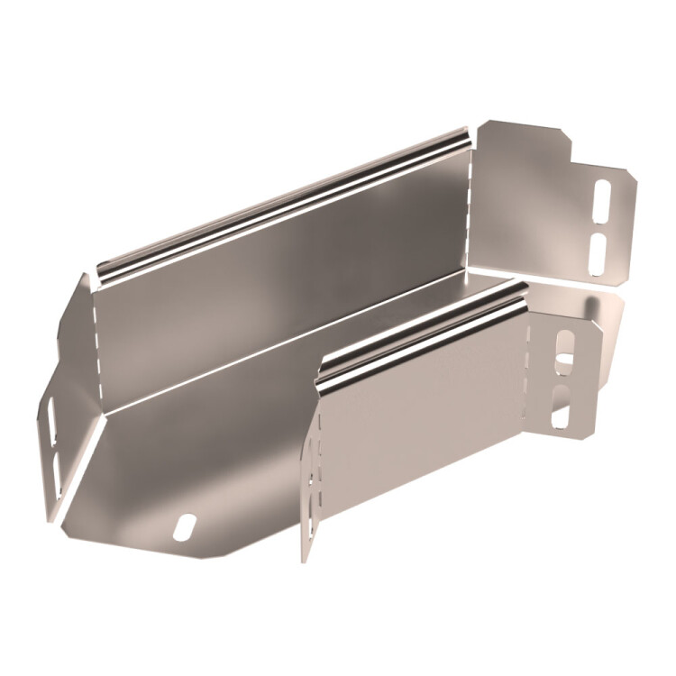 Аксессуар в исполнении AISI 409 – это изделия, изготовленные из ферритовой марки нержавеющей стали 08Х13, обладающих коррозионной стойкостью и высокими прочностями показателями, что позволяет применять изделия, в различных непищевых отраслях промышленности. Угол горизонтальный 90 градусов предназначен для поворота кабельных трасс в горизонтальном направлении на 45 градусов, Для перфорированных и глухих лотков. В комплект не входит крышка.